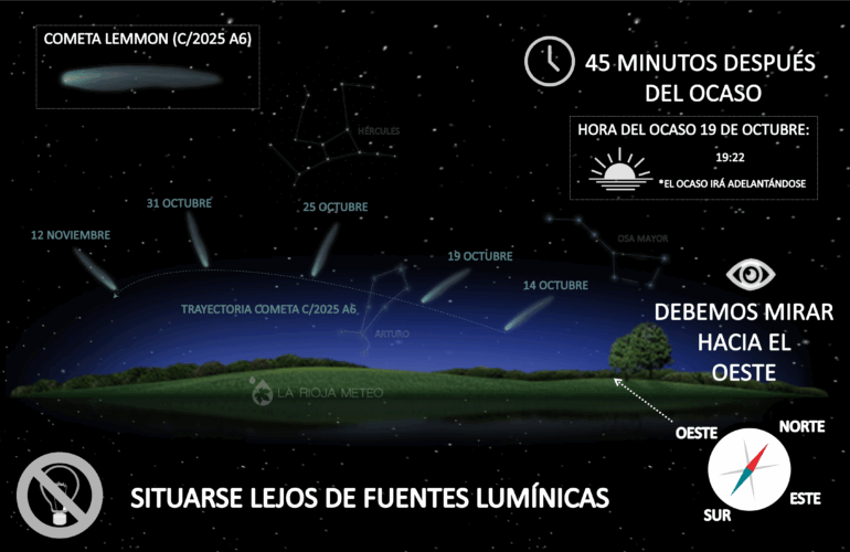 Desde el 10 de octubre, el cometa Lemmon incluso llegó a ser circumpolar en las latitudes más altas (por encima de los 48° N), lo que significa que nunca llegaba a ocultarse bajo el horizonte durante la noche. Ahora esa zona se va desplazando hacia latitudes aún más septentrionales (más hacia el norte), pero en buena parte de España y Europa el mejor momento para observarlo será entre finales de octubre y comienzos de noviembre.
