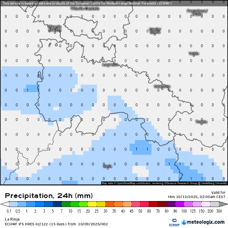 Sólo esperamos lloviznas muy débiles durante el viernes por la mañana en la Ibérica (cara norte) fruto de la retención orográfica de los vientos del norte, testimoniales (<1 litro). No esperamos ni gota de lluvia durante el sábado 11 de octubre. Es probable que las lluvias mediterráneas sean capaces de remontar ligeramente el Ebro durante el domingo, pudiendo dejar en el último cuarto del día, algunas lloviznas por retención de flujo de SurEste en puntos de la Ibérica (Sierras de Cebollera, Urbión, Alcarama, Préjano…), preferentemente en su cara Este. Migajas. Estos son los acumulados previstos para el viernes y domingo por diferentes modelos.