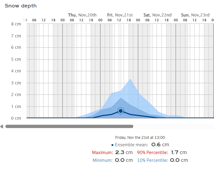 Con mucha mayor probabilidad en el caso de Santo Domingo que Haro, debido a la mayor altitud del primero, las medias del modelo ECMWF indican unos 2,6 cm en Haro y unos 5,4 cm en Santo Domingo de la Calzada.