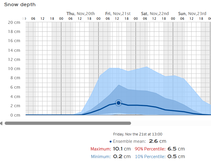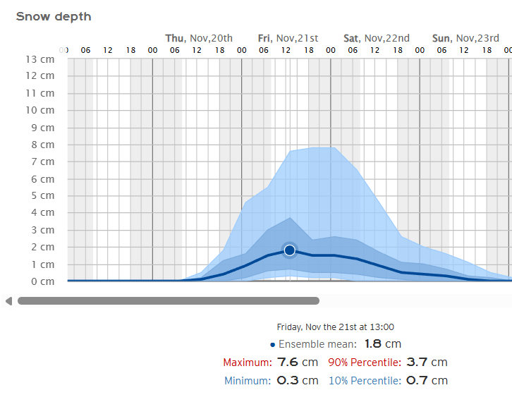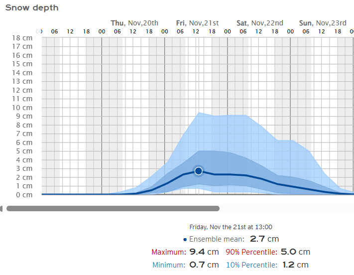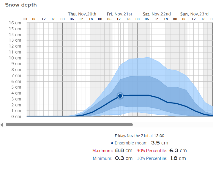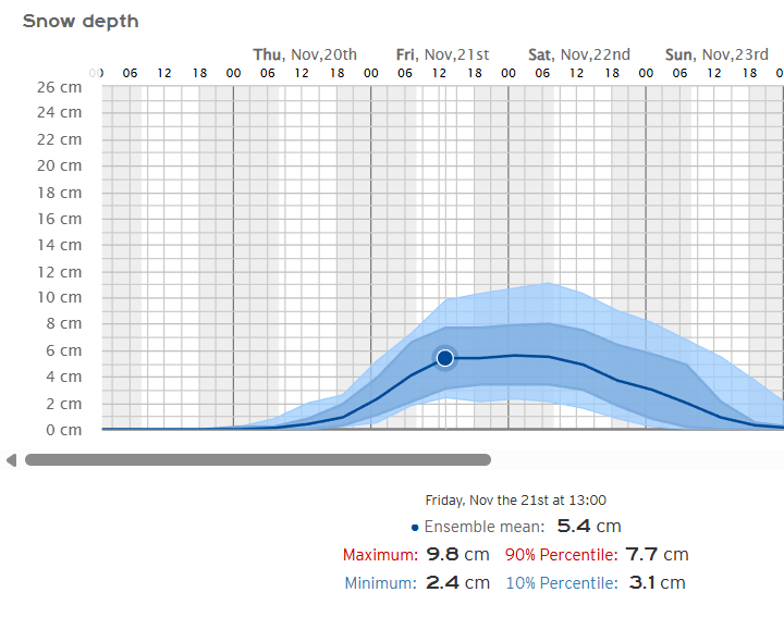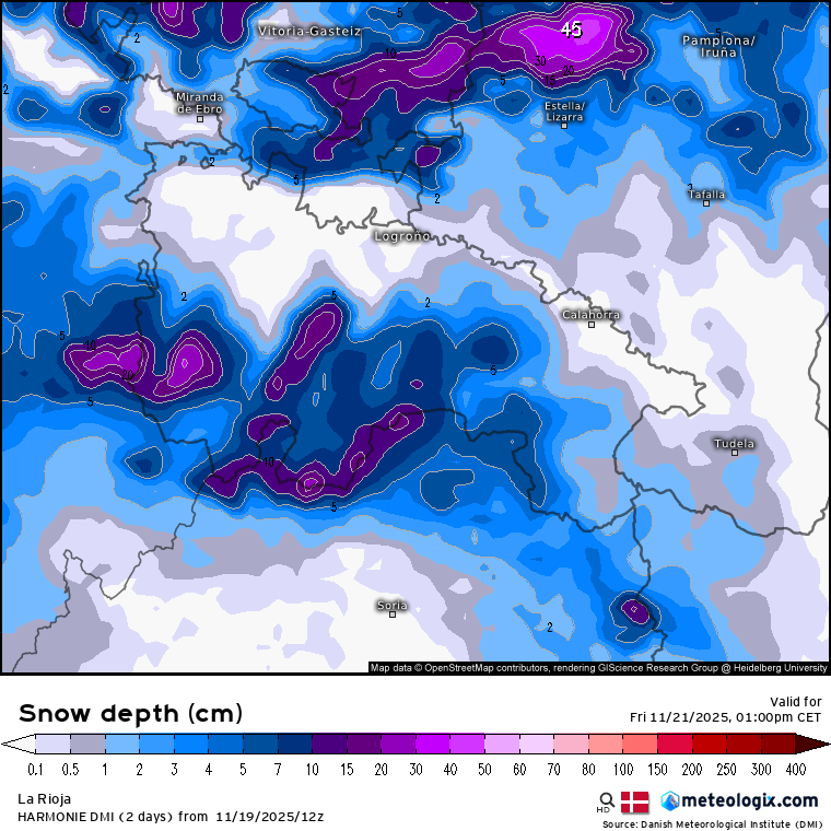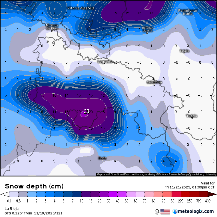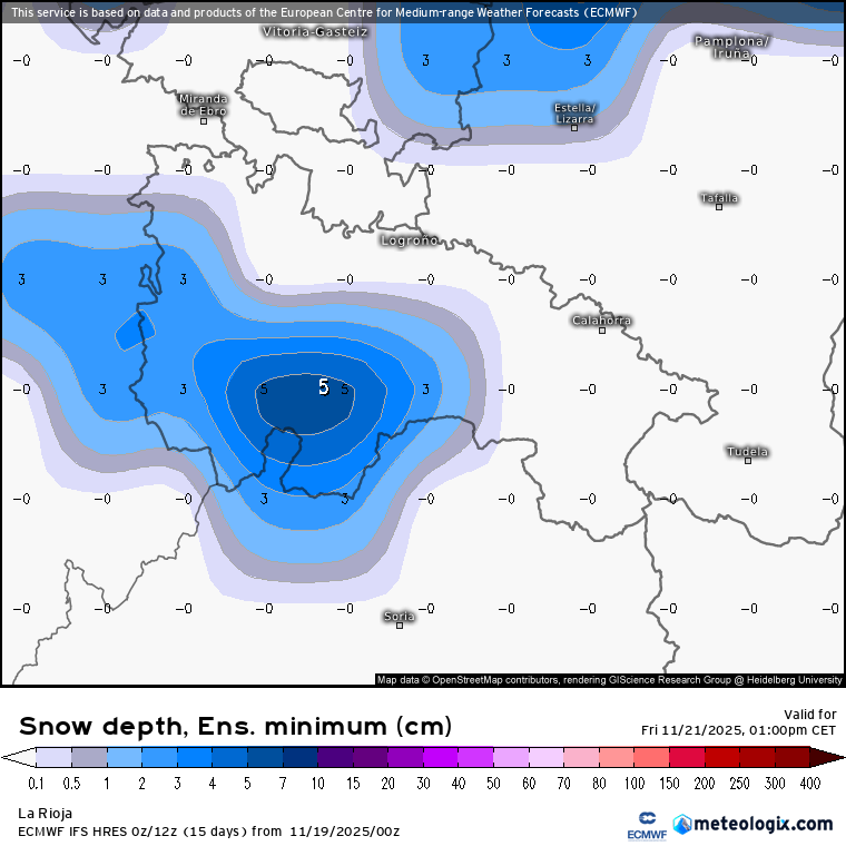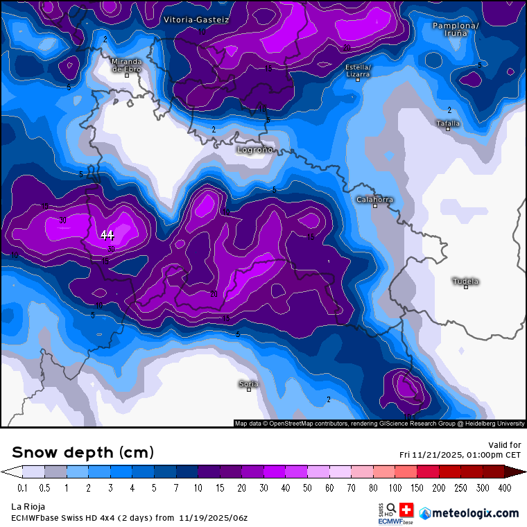 Podrían superarse con facilidad los 15/20 cm en gran parte del cordal ibérico, todas las sierras riojanas se teñirán de blanco en mayor o menor medida. Ojo con el modelo SWISS-ECMWF que llega a superar los 30 cm en las cumbres más altas.