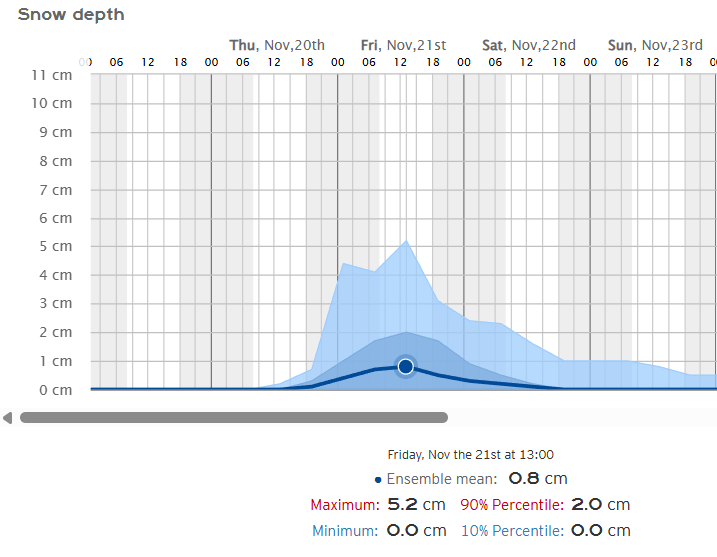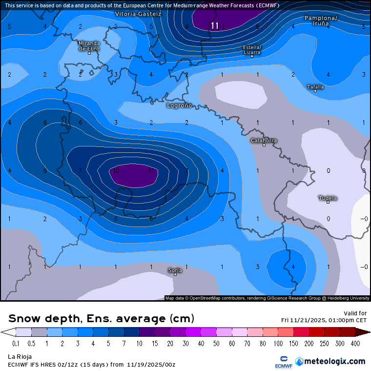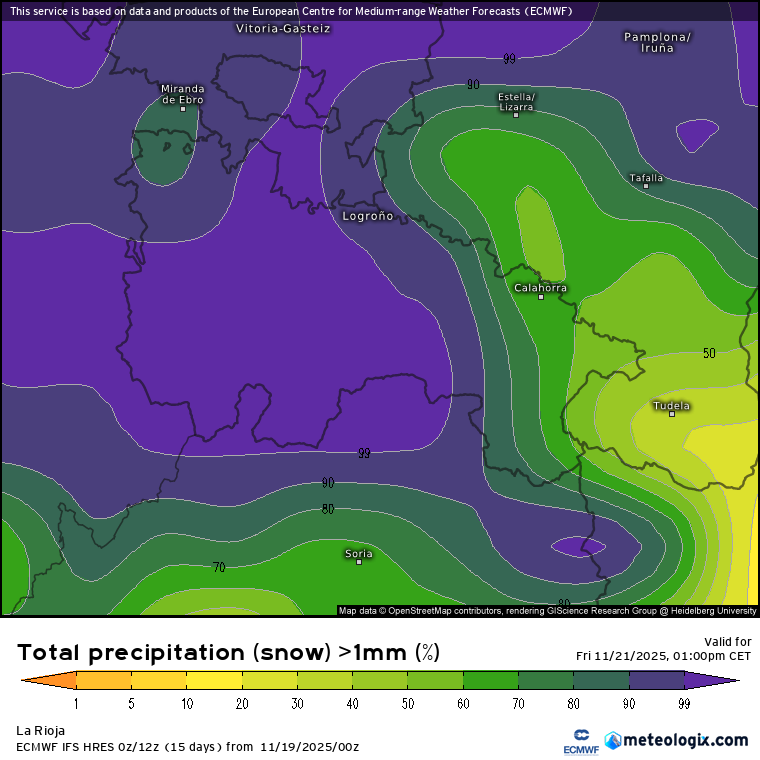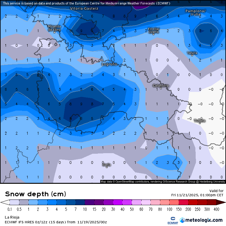 Tanto Calahorra como Alfaro tendrán la penalización de su altitud, por debajo de los 350 metros. Así que salvo desplomes (que podrían ocurrir), la nieve quedaría un poco más alta. Sin embargo, el modelo ECMWF es optimista y apunta a que podrían acumularse algo más de medio centímetro en chubascos fuertes y prolongados (especialmente y más probable en Calahorra, donde la meteo a veces da sorpresas).