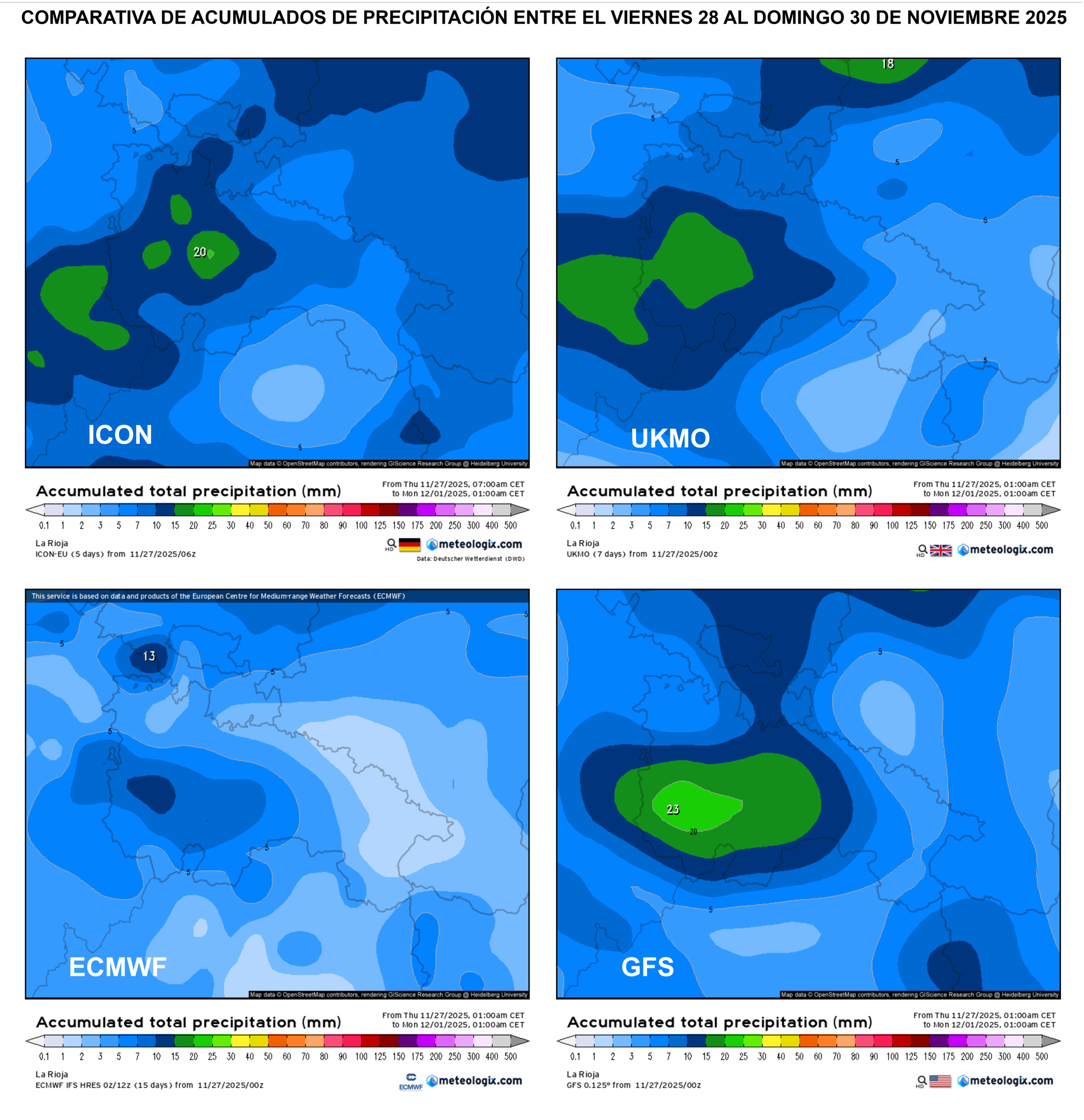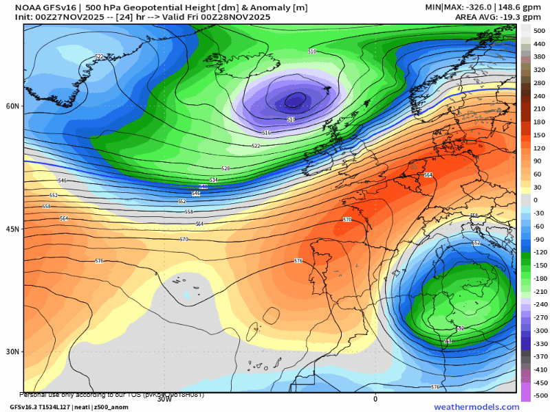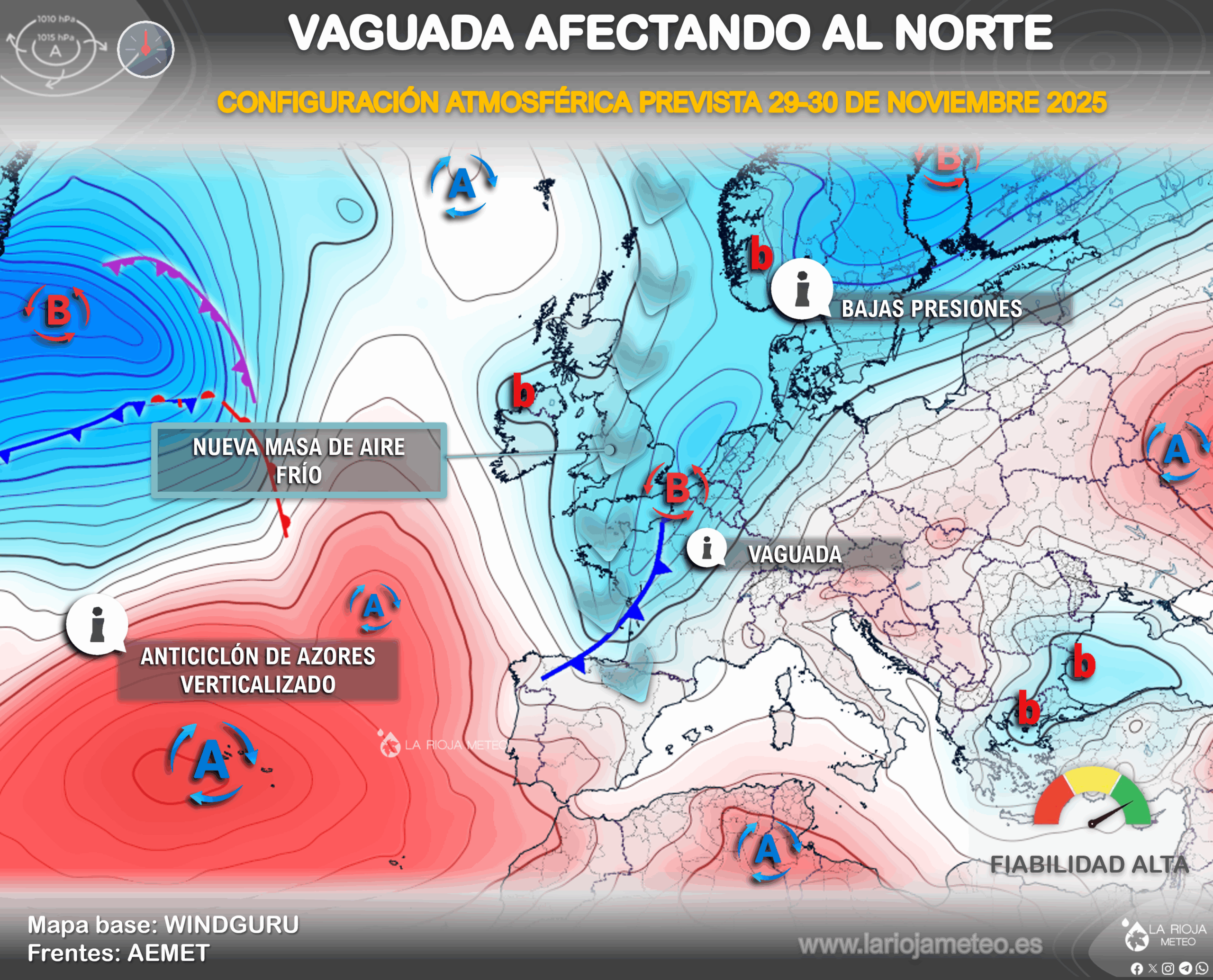 Tras la entrada del anticiclón en la Península Ibérica desde este jueves, el tiempo se estabilizará con una tregua que tendrá una ventana de «tiempo tranquilo» hasta la tarde/noche del sábado 29 de noviembre, cuando una nueva vaguada de aire frío impactará en la región. Esta vaguada, marcada en «V» propiciará el paso de frente frío muy activo alrededor de las últimas horas del sábado y madrugada al domingo, con un posterior descenso térmico que volverá a llevar la nieve a nuestras montañas a partir de 1000 metros. La situación de «nortes» se mantendrá en un desapacible domingo aunque con precipitaciones más probables e intensas en la Ibérica.