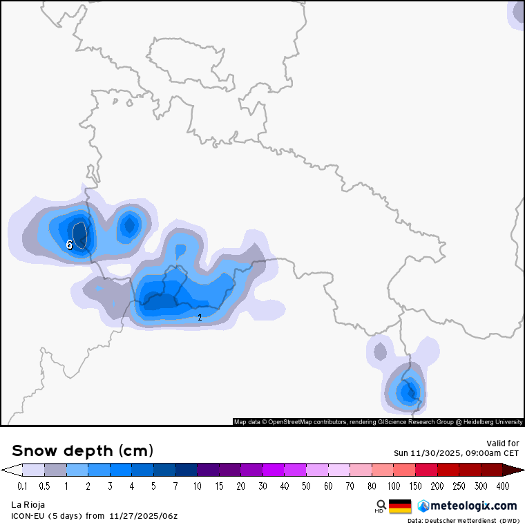 Respecto a la nieve, con la subida de cota prevista entre el jueves y sábado a la tarde, nuestras montañas irán perdiendo espesor, y es probable que la entrada del frente a últimas horas del sábado termine por «exterminar» la poca nieve que quede por debajo de los 1800 metros. Sin embargo, con la entrada del aire frío, en la madrugada del domingo, podrían volver a producirse nevadas en cotas de 1000/1200 metros que pudieran dejar entre 3/6 cm en las montañas riojanas.