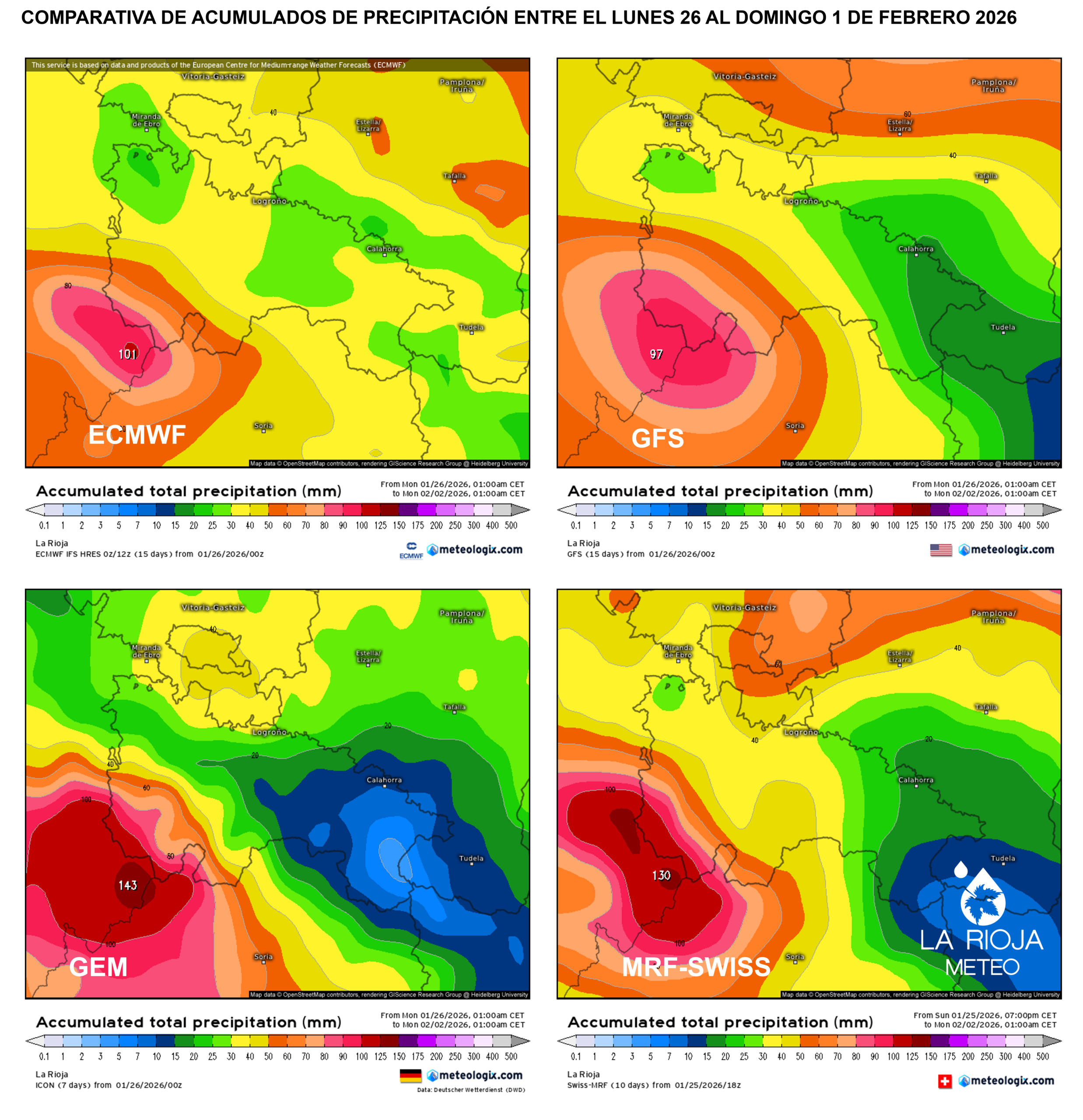 Esperamos precipitaciones totales en los próximos 7 días que podrían rondar los 100/150 litros en áreas de la cara sur de la Ibérica (Urbión ,Cebollera…), estando en general por encima de los 50 litros en toda la Ibérica suroccidental. Acumulados algo más cambiantes en áreas del valle, aunque en general alrededor de los 25/30 litros en áreas de la ribera alta y media, y los 10/20 litros en la ribera baja.