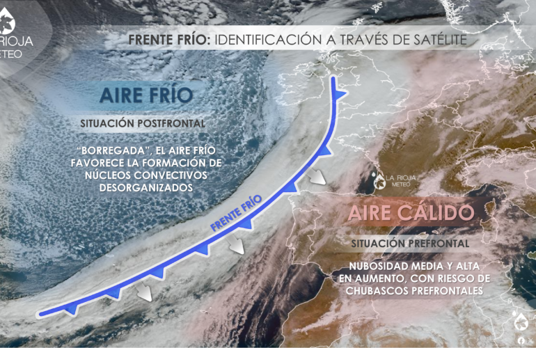 En satélite, un frente frío activo se reconoce casi como una línea de ataque, con nubosidad compacta y organizada.