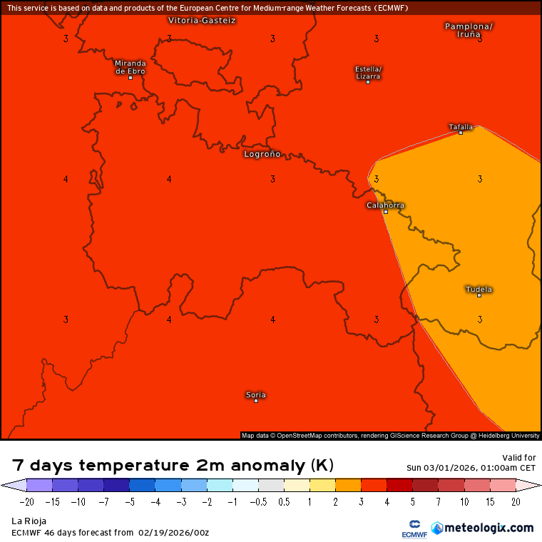 Pese a que durante el fin de semana las temperaturas tenderán a bajar de manera acusada y volveremos a ver llover, en mayor o menor medida en La Rioja, la semana en un contexto climático general, estará dominada por las anomalías térmicas positivas (+3/+4ºC) y las anomalías pluviométricas negativas (-10/-15 litros).