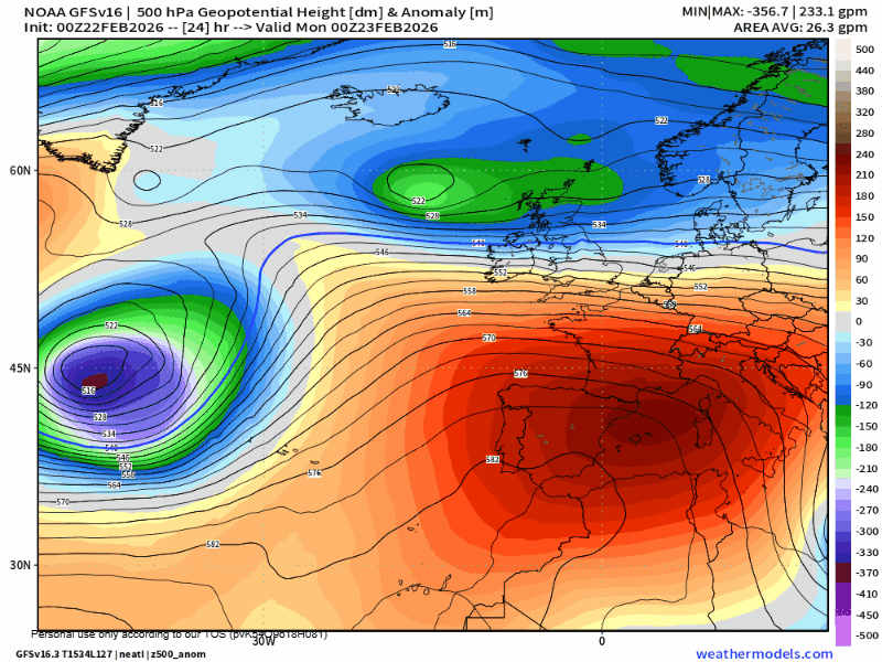 Al menos hasta el jueves 26 de febrero NO caerá ni gota, quizás algún chubasco despistado en la Ibérica por el tránsito de ese frente durante el miércoles pero, en cualquier caso, muy poca cosa.