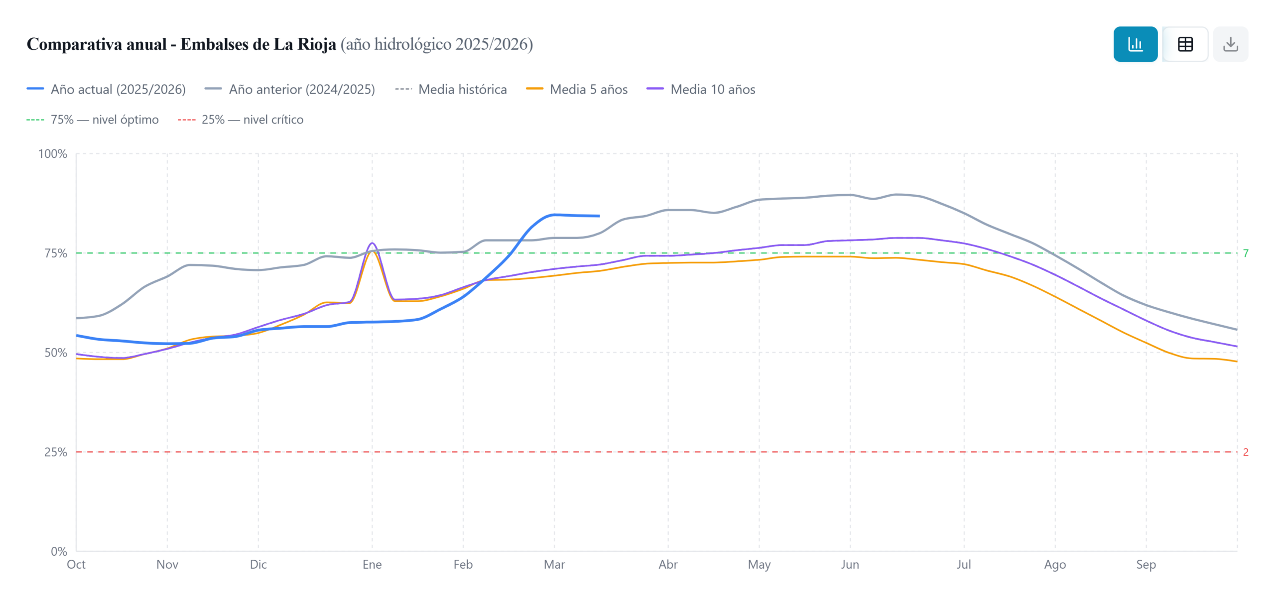 Los embalses de uso consuntivo de La Rioja almacenan actualmente 154 hm³ de agua, lo que supone el 84,6 % de su capacidad total. La variación en las últimas dos semanas ha sido de +18 hm³, lo que representa un incremento del 9,9 %. Se trata de una situación hídrica claramente favorable, más propia de finales de primavera que de mediados de marzo.