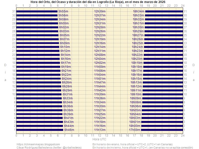 Este fenómeno, conocido como Equilux, tendrá lugar en la Rioja el 17 de marzo 2026. Como vemos, a pesar de que el equinoccio marca el inicio oficial de la primavera, la verdadera igualdad entre la duración del día y la noche no ocurre exactamente el 20 de marzo.