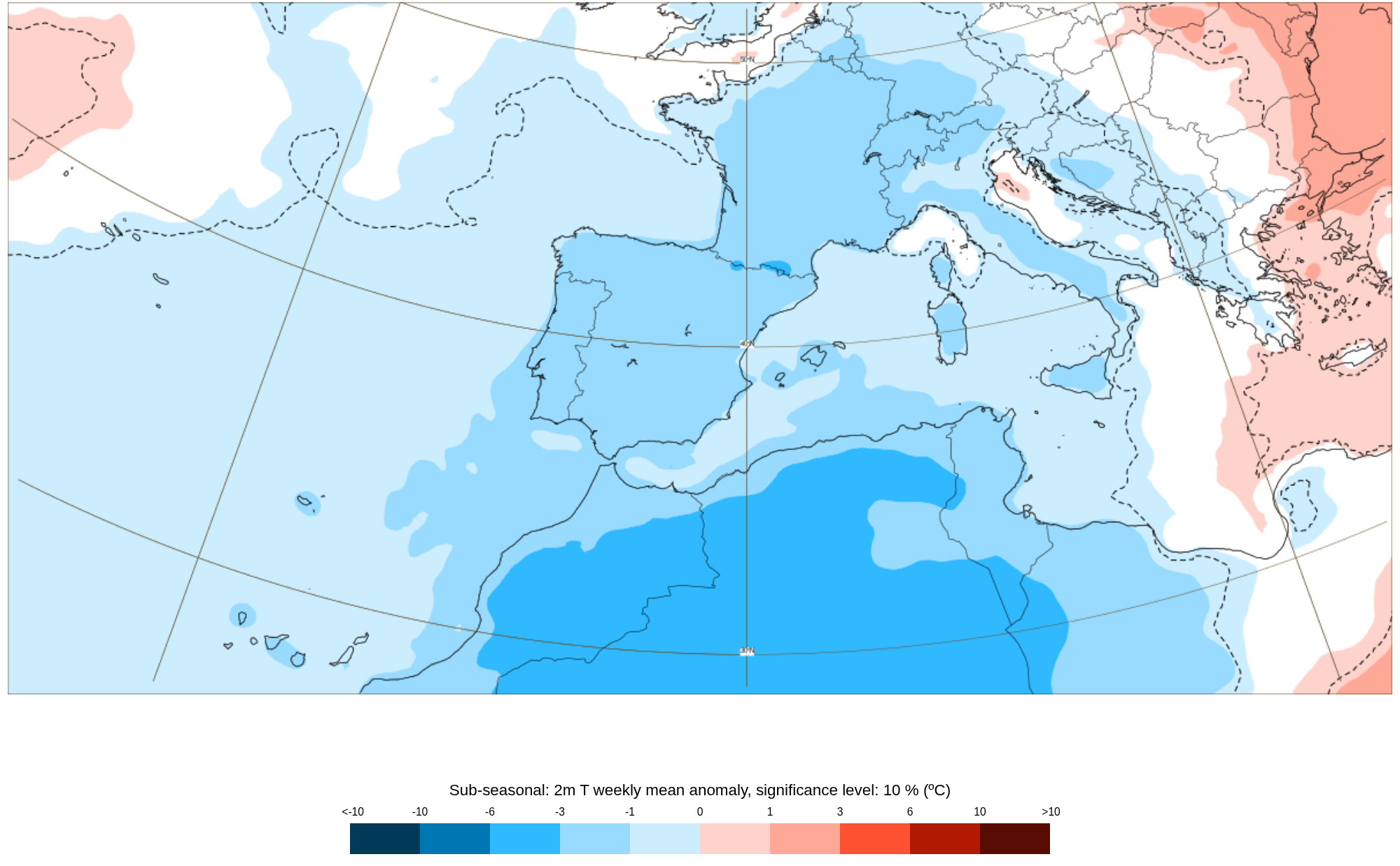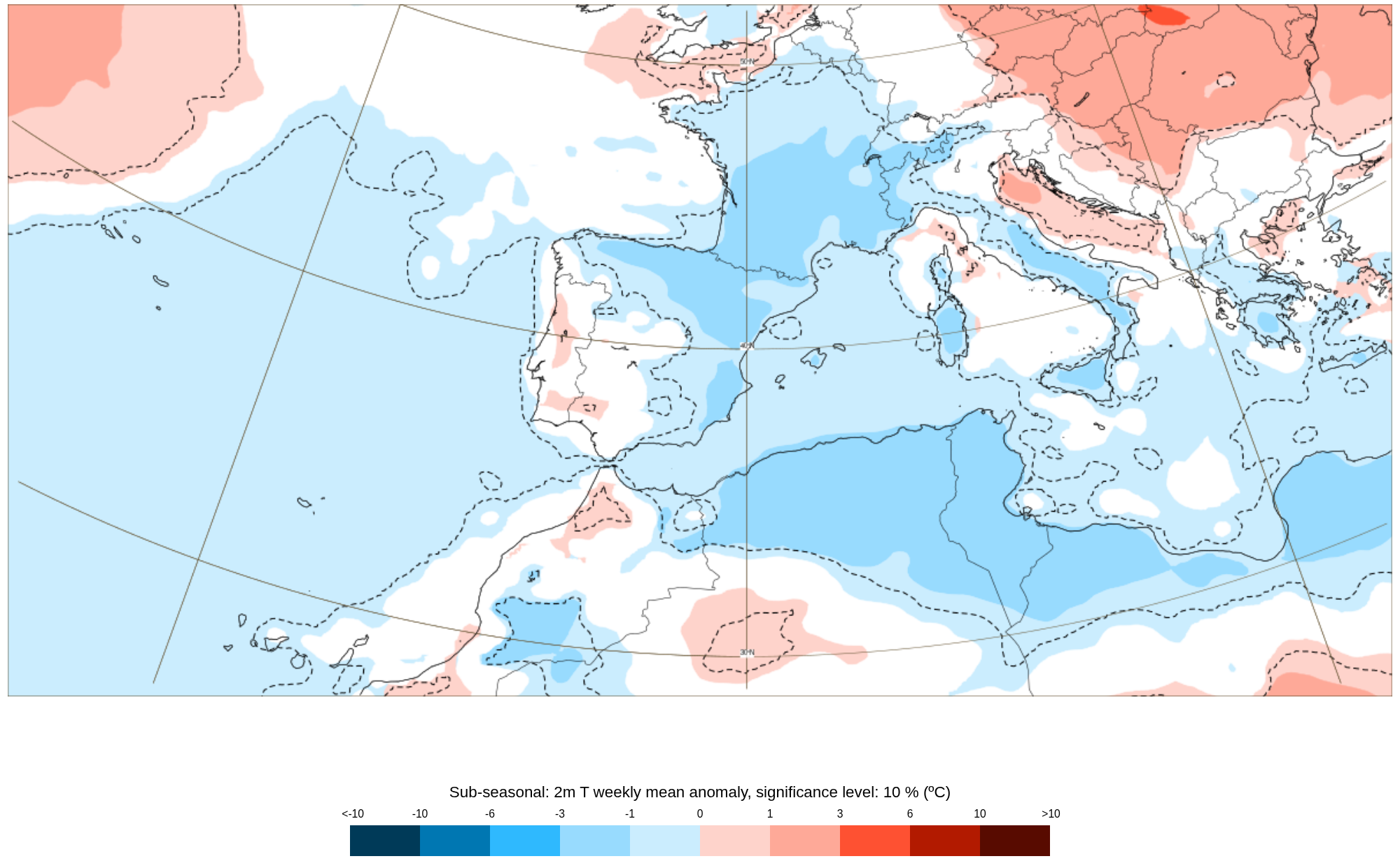 Aun así, hay una señal bastante robusta: temperaturas más bajas de lo normal en gran parte de la Península Ibérica durante todo el periodo (del 26 de marzo al 6 de Abril).