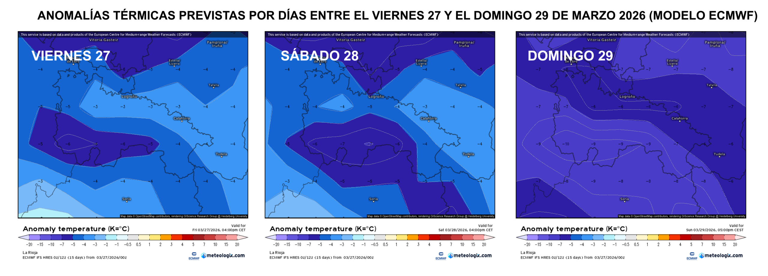 El momento más frío se espera entre la tarde del sábado y el domingo, cuando se alcance el pico del episodio, como podemos observar en el siguiente mapa de anomalías térmicas. El frío se irá incrementando durante el fin de semana.