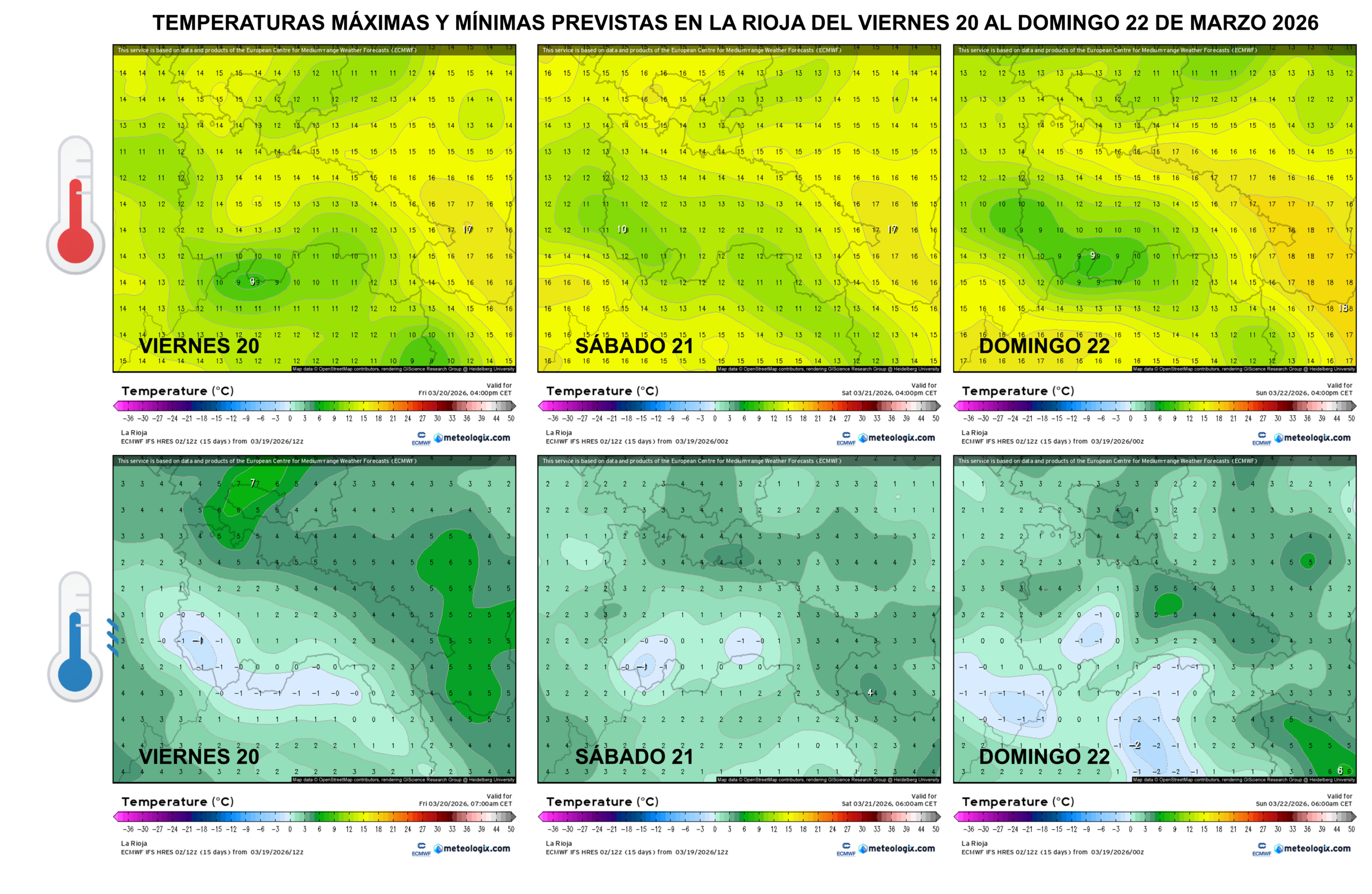 Al final, ni la borrasca Therese ni la bolsa de aire frío llegarán a La Rioja este fin de semana, tal y como parecía a comienzos de semana. El escenario se desinfla y el tiempo quedará en una situación intermedia, con flujo de vientos del SurEste, mayor presencia de nubosidad de tipo bajo, algo de calima y temperaturas más contenidas, pero sin precipitaciones a la vista. En definitiva, un ambiente más fresco que en días anteriores, aunque dentro de valores bastante normales para la primavera, que dará comienzo este mismo viernes 20 de marzo.