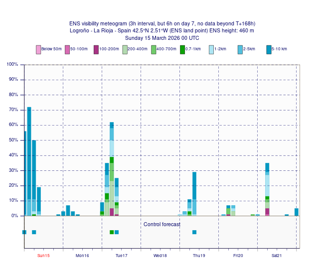 Las nieblas matinales podrían convertirse en uno de los elementos meteorológicos más característicos del tiempo en Logroño durante esta semana. Los meteogramas de visibilidad muestran que entre el martes y el jueves aumenta ligeramente la probabilidad de reducción de visibilidad durante la madrugada y primeras horas del día. Esto sugiere la aparición de nieblas o brumas matinales en el eje del valle del Ebro, algo bastante habitual en situaciones de estabilidad anticiclónica.