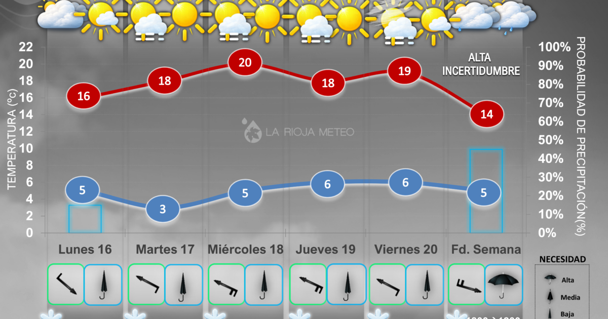 En este tipo de situaciones incluso puede aparecer inversión térmica, es decir, temperaturas más altas en zonas elevadas que en el propio fondo del valle, aunque se rompería rápidamente por el calentamiento diurno. Por eso no sería extraño que en zonas de la Sierra de Cantabria o en áreas más elevadas cercanas a Logroño las temperaturas superen los 20 °C, mientras que en la capital riojana se queden algo más contenidas si las nieblas persisten algo más durante la mañana.
