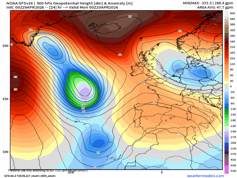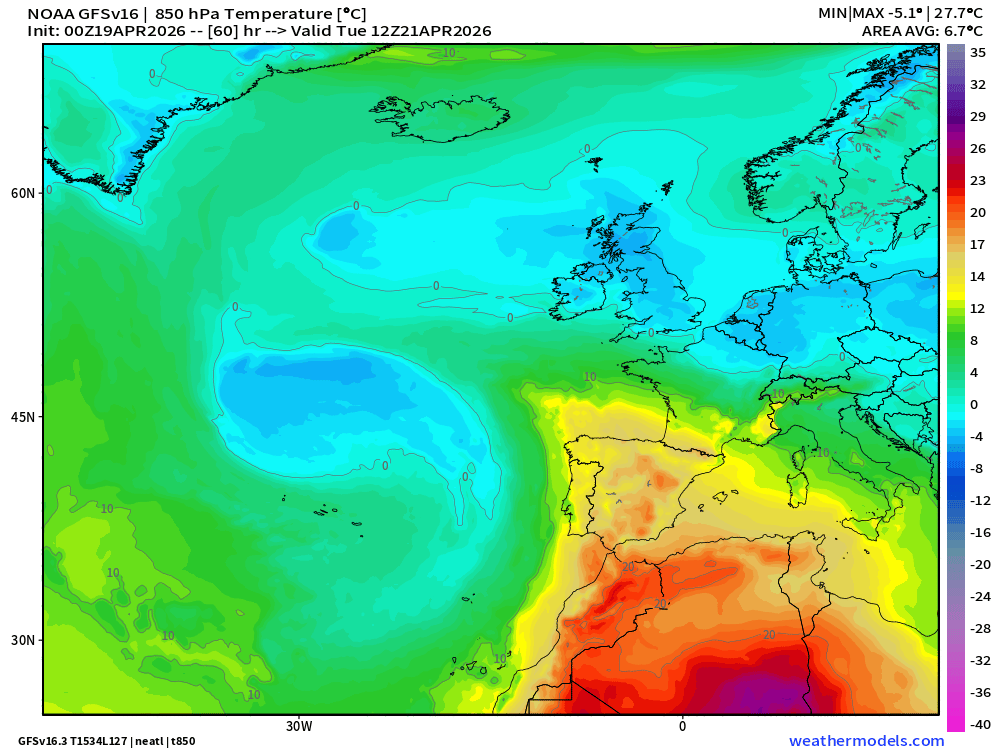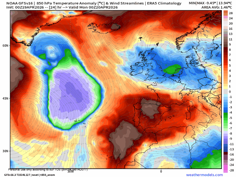 Situación definida por 2 centros de acción: borrasca al oeste y anticiclón en nuestra vertical. Por un lado, una borrasca se descuelga hacia el entorno de Azores. Por otro, el anticiclón migra hacia el norte de Europa e Islandia, configurando un bloqueo anticiclónico. Entre ambos sistemas, la dorsal subtropical sigue empujando desde el norte de África.