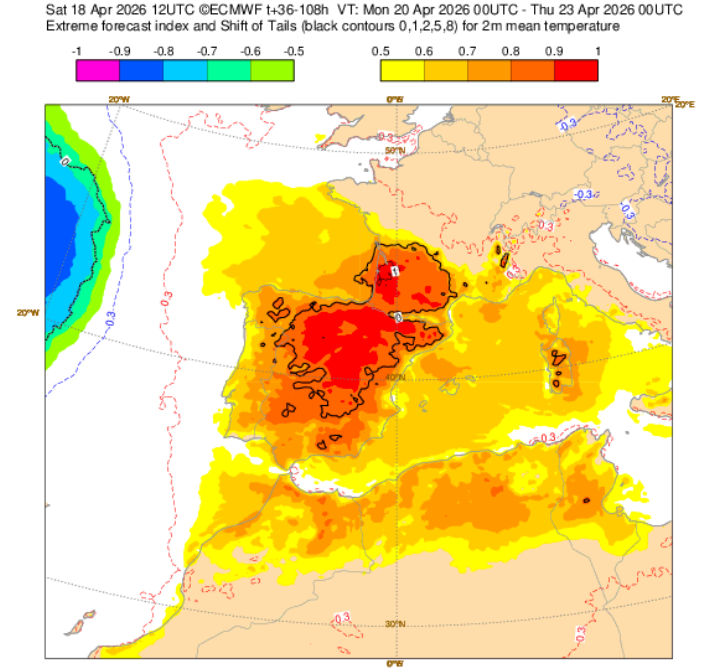El índice EFI (Índice de tiempo extremo) del modelo ECMWF se sitúa cerca de 1, lo que indica una situación extrema, con un carácter muy anómalo y muy poco habitual para la fecha.