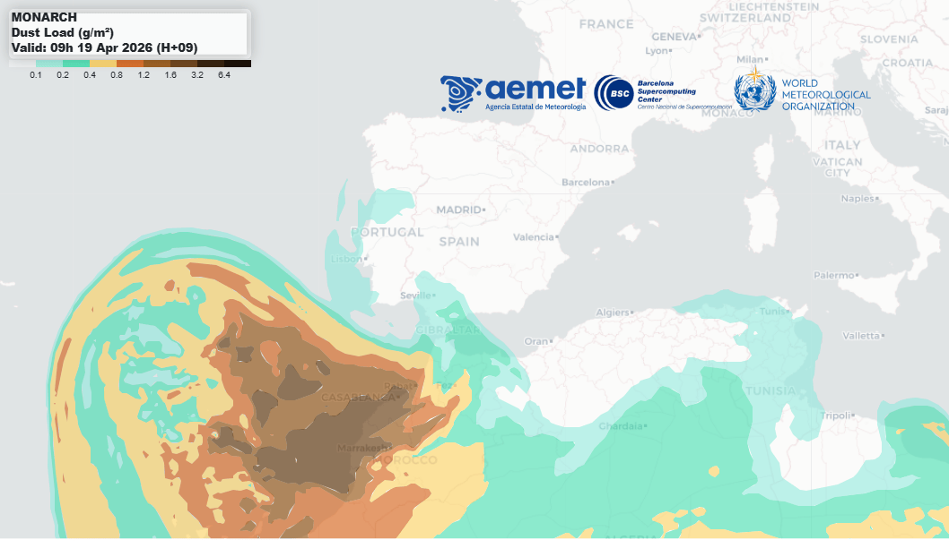 Por si fuera poco, la configuración atmosférica favorecerá una nueva irrupción de polvo en suspensión con una carga de polvo entre 0,5 y 1,5 g/m2. Situación desde luego más típica de plena canícula veraniega que de mediados de abril.