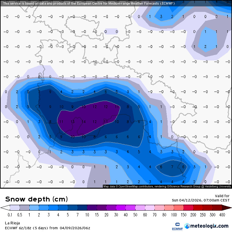 Entre la tarde-noche del sábado 11 y la mañana del domingo 12, la cota de nieve caerá hasta el entorno de los 800/1000 metros (puntualmente más baja por desplomes). En base al modelo ECMWF: