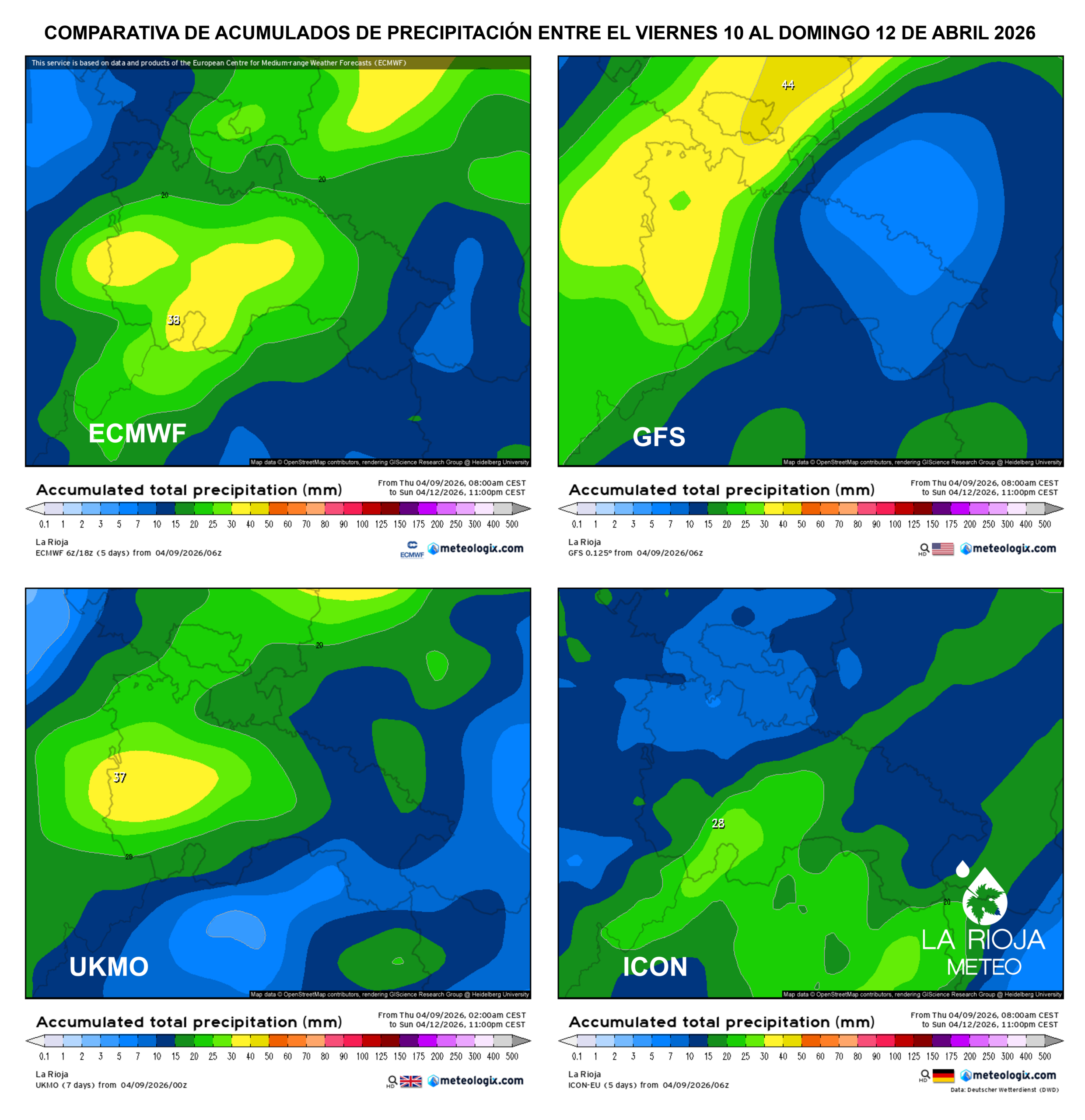 - GFS, ECMWF y UKMO → apuestan por mayor afectación en la mitad occidental con picos de hasta 40 litros.