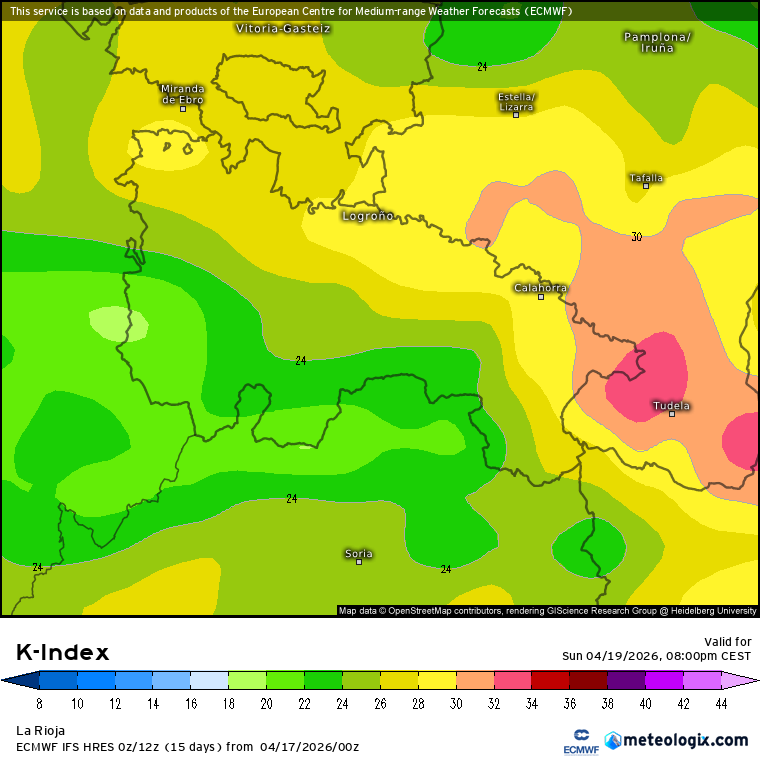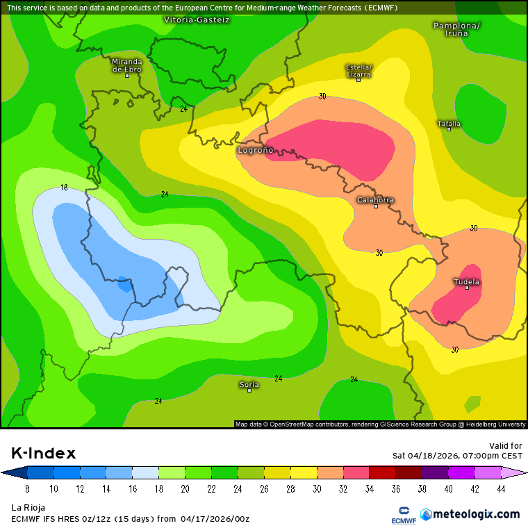 Los valores K-index previstos son elevados en toda la región. Para que nos hagamos una idea valores por encima de 20 suelen indicar mayor riesgo de tormentas. Como vemos, gran parte de la ribera y parte de la Ibérica ronda valores superiores a los 20 en la tarde del sábado y domingo.
