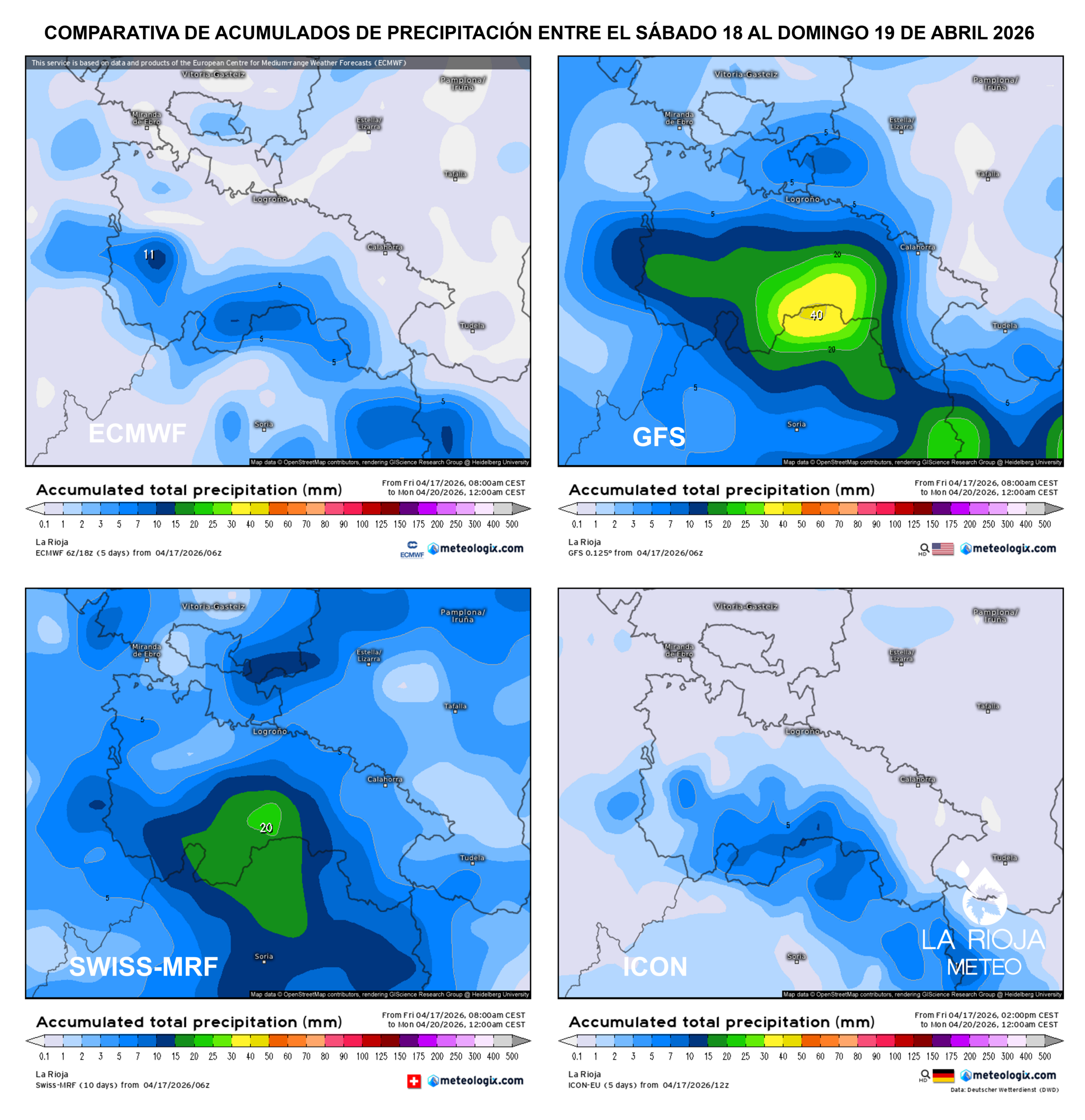 Los principales modelos (ECMWF, GFS, ICON, SWISS-MRF) coinciden en algo clave: sin grandes acumulados pero con eventos locales potencialmente intensos.