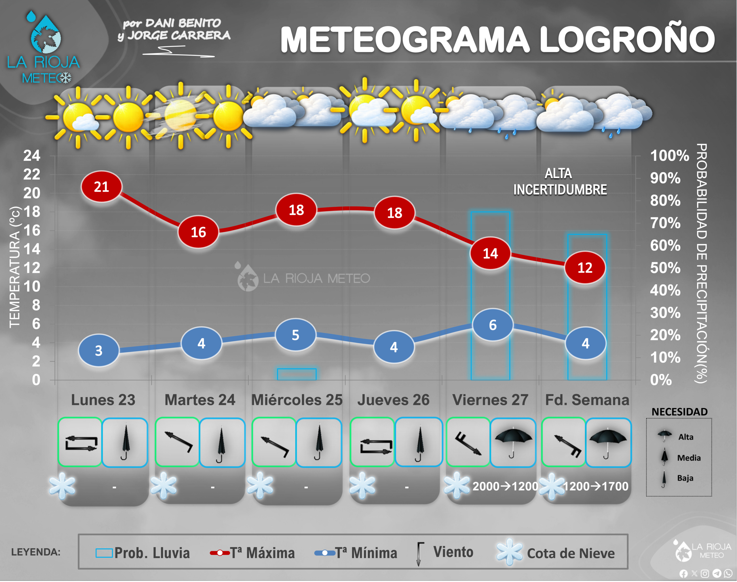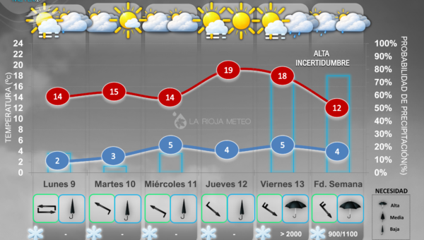 Sección específica donde se exponen las predicciones meteorológicas para la ciudad de Logroño y la comarca de la Ribera Media del Ebro. Esta área concentra cerca del 60 % de la población de La Rioja, por lo que el estado del tiempo tiene un impacto directo en la actividad diaria, la movilidad, la agricultura y los eventos al aire libre.