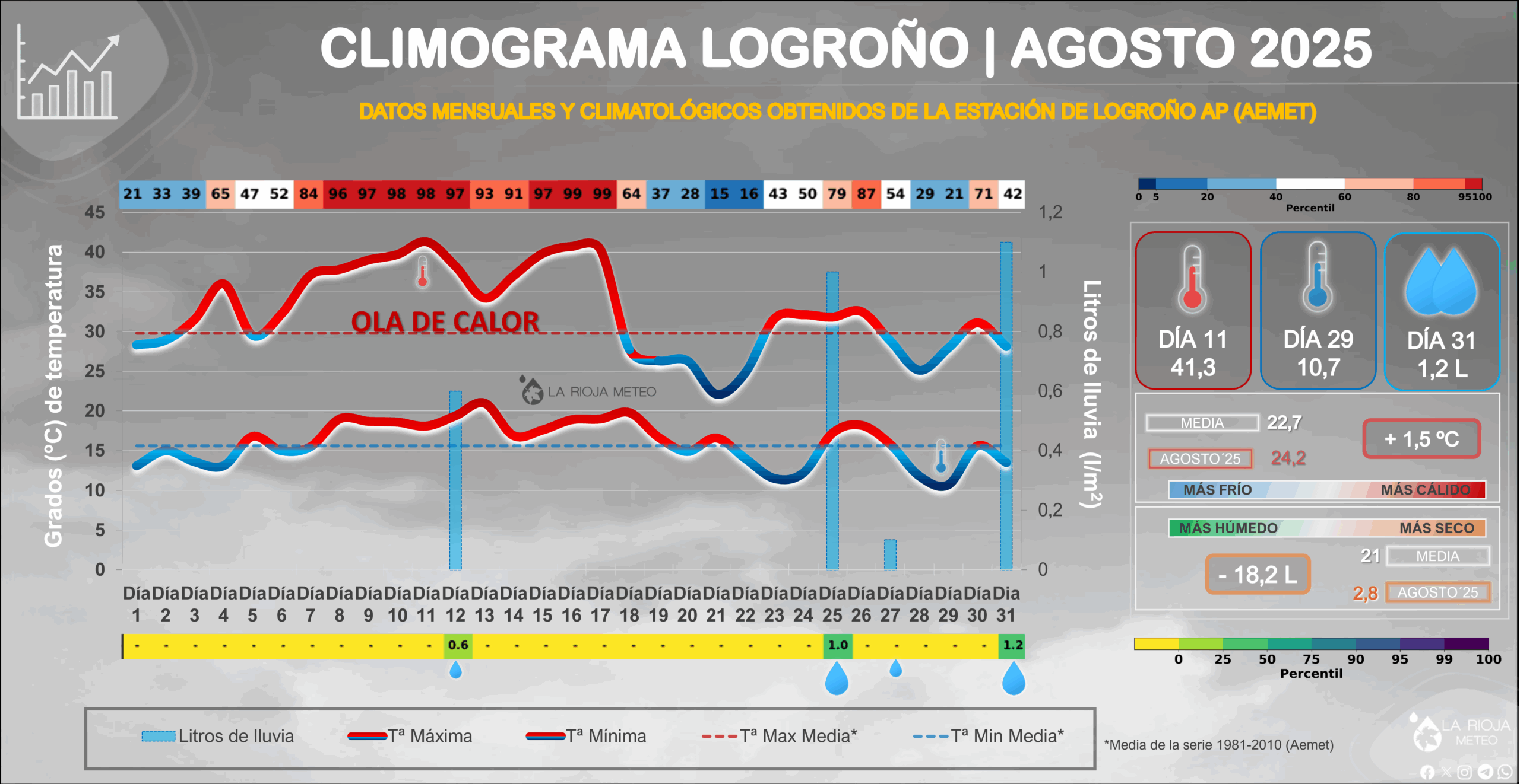 Agosto de 2025 ha sido claramente más cálido y mucho más seco de lo habitual en Logroño. Un mes dominado…